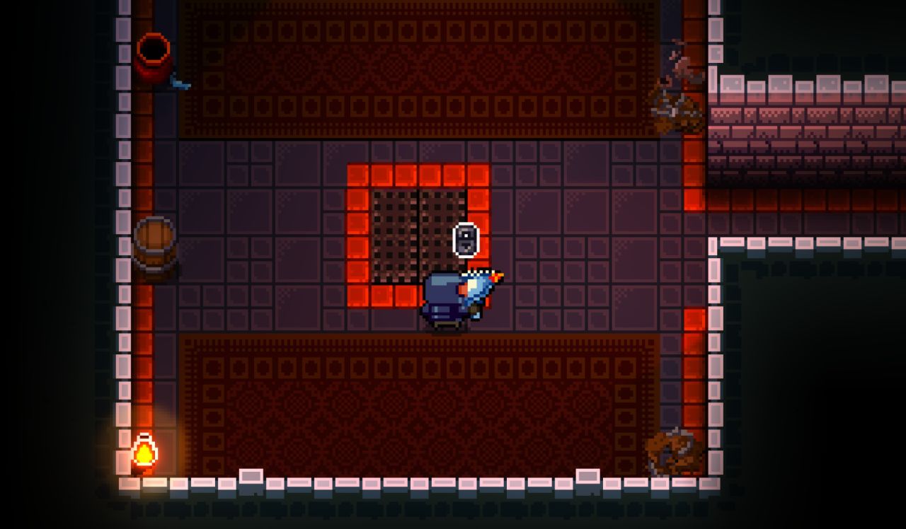 在《挺進地牢》的第一膛室中,存在着各種各樣的機關,有受到射擊會爆炸對周圍造成高額傷害的爆桶,有支持手動觸發與子彈射擊後觸發使吊燈墜落造成範圍傷害的機關。