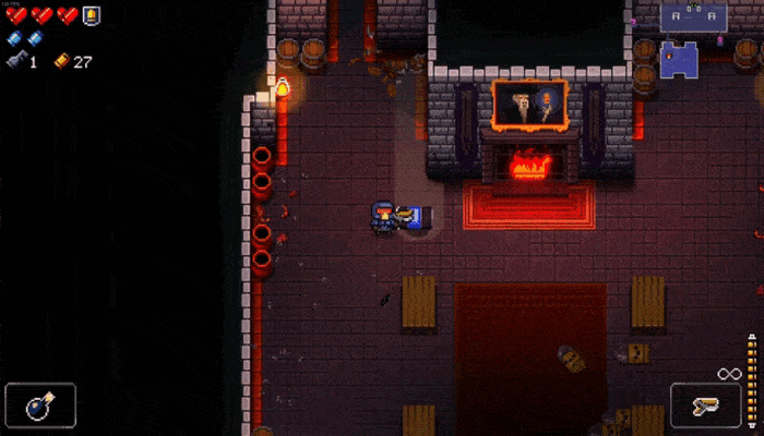 而在第一層中永遠會固定的出現一個存在着壁爐的房間,壁爐上方掛着一位老人的肖像畫,彷彿永遠燃燒着的壁爐中,便是前往第1.5層獲取直面子彈國老國王資格:古老紋章道具的機關。