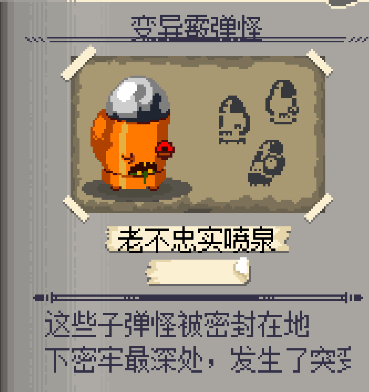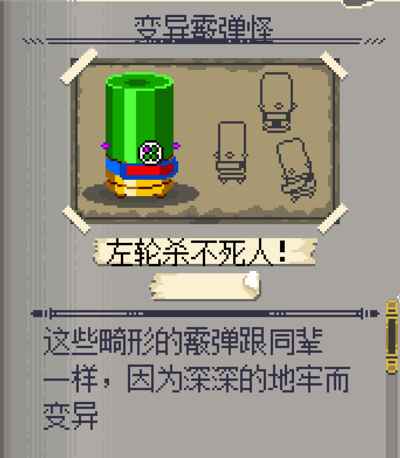在《挺進地牢》中,通關表面上的五層膛室首次擊敗槍龍後,遊戲才稱得上是真正的開始。首次擊敗槍龍後,來到終點的我們發現缺少了抹殺過去的子彈,僅僅靠一把槍是沒有辦法抹殺過去的,於是在收集四種材料的途中,地牢的真正祕密也將揭示在玩家面前。