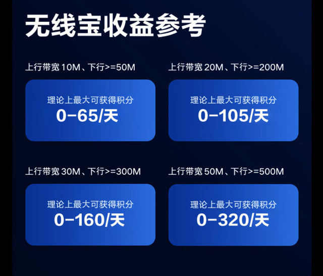 ▲開啓無線寶之後,前七天爲調試模式,每天固定10積分,所以這裏我放上官方給出的積分收益參考,大家可以根據自己的網絡情況查看大致的受益情況。