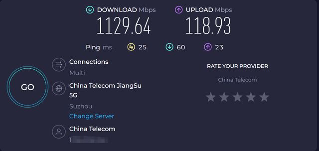 ▲將光貓連接在路由器藍色的2.5G網口上,通過筆記本電腦進行speedtest,實測外網下載帶寬高達1130Mbps,可見所謂的千兆光纖還是有額外速度冗餘的,因此個人強烈建議,選擇路由器時,至少要選擇WAN口是2.5G口的,以享受更快的外網速度。