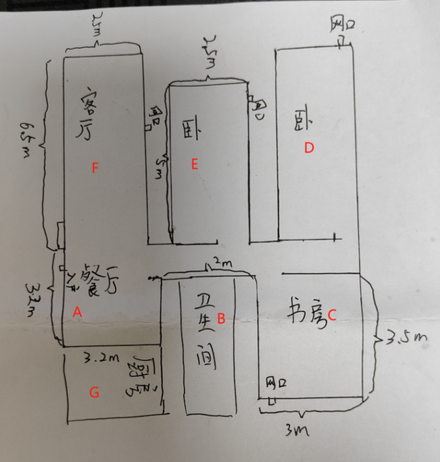▲這是我家的戶型圖手繪板,我將路由器的功率調整爲穿牆模式,放在了餐廳入戶處,對整個房間多個點位進行信號強度測試。