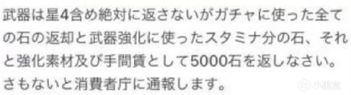 在處理如何解決該問題的工單中,日本網友開始流行使用含有威脅意味的詞彙。“さもないと”。這個詞彙雖然是“不然”但包含了威脅的意思日本人讀這話的感覺就像是要是你不還錢老子X你全家....配上前面和後面的商務用敬語顯得十分滑稽。武器包括四星武器在內絕對不會退還,但請退還用於抽卡的所有石頭和用於武器強化的體力部分的石頭,以及作爲強化材料和費用的5000石頭。如若不然將向消費者廳舉報。