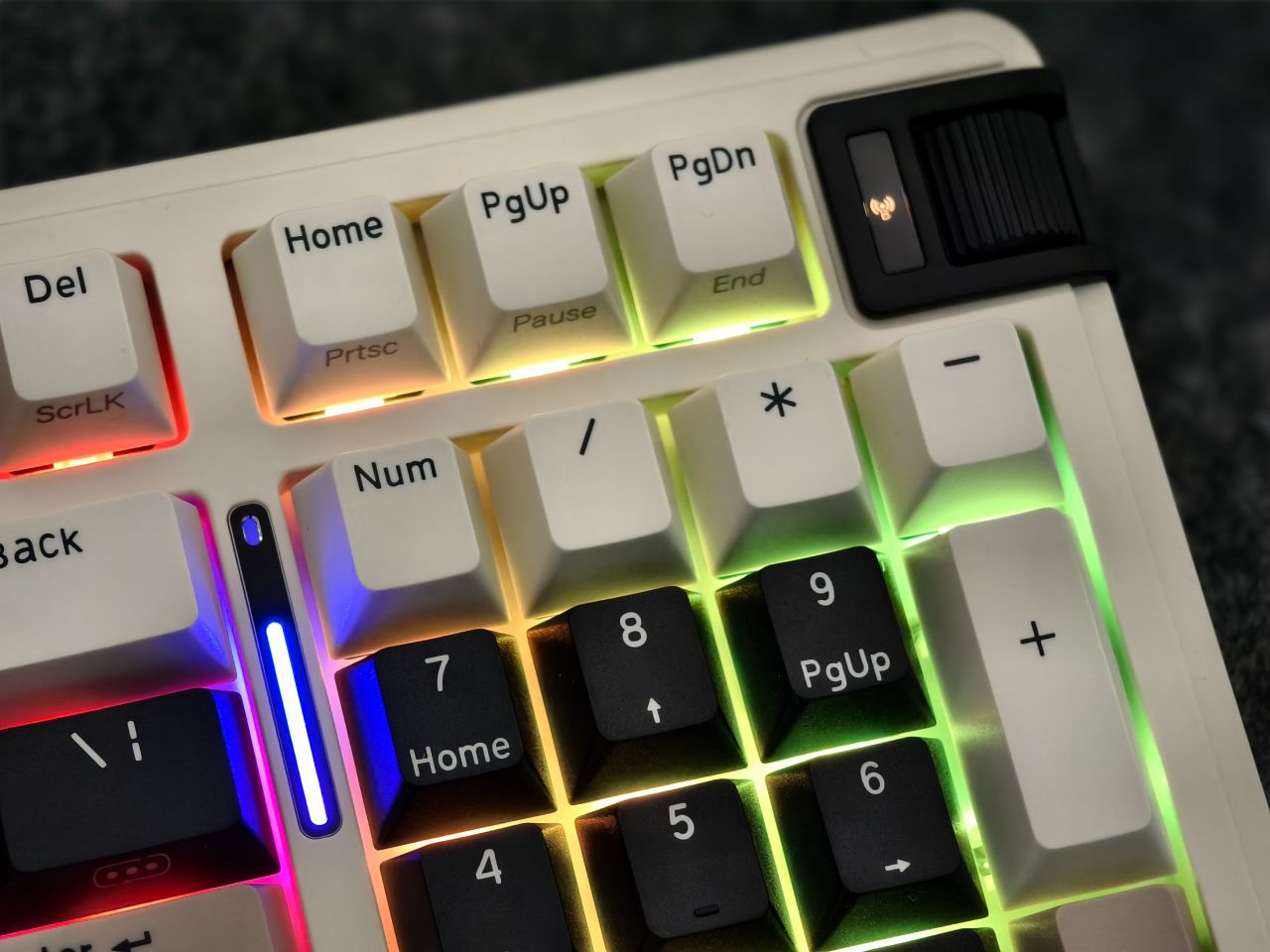 在小鍵盤與主鍵位的夾縫中K98還塞進去了一根撞色燈條,並將上方用以顯示小鍵盤Num的指示燈,燈珠數量看起來是頗爲不錯的,裏面添置了勻光板。
