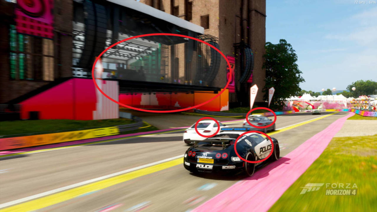 在嘉年華主舞臺前拍攝您車輛和2輛其他玩家或智能車手在一起的相片,位置如圖,獎勵爲超級抽獎(拍照藍圖:180 175 406,進入藍圖當跑到嘉年華主舞臺時拍攝三輛車入鏡即可完成)