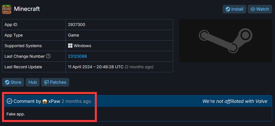 這個xPaw就是SteamDB創始人,他還表示2個月前上架到Steam的那款《我的世界》也是假冒APP