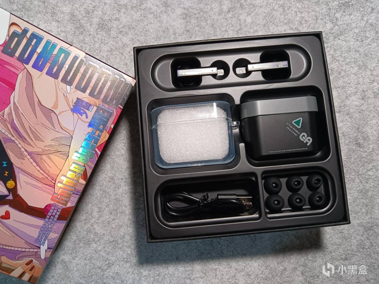 打開之後就可以看到耳機以及耳機的充電倉了,具體的外形下面再說,現在看其他配件,首先就是做了一個保護套,觸摸起來相對比較柔軟,但是又不會軟趴趴的,然後可以看到做了點狀的紋路,裏側摸起來會很澀,這個設計一來是會更好看一點,二來把耳機放進去會更加緊緻,不容易掉出來,其實這裏設計的是比較緊的,裝進去就很難拿出來,我是用數據線插進接口才頂出來的,平時使用的時候我是比較建議戴上去的,然後大家可以看到耳套以及數據線,上面的一層拿下來,然後就可以看到一個卡片、說明書、售後卡以及海報樣式的提示卡,就是外包裝上的形象,這個字體如果做成鐳射的就更好看了。