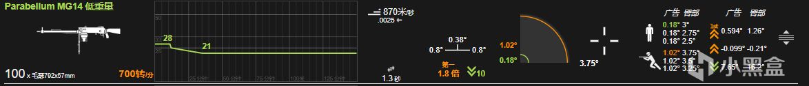 12米內一槍28衰減至35米最低傷害21(這類機槍傷害大差不差),870m/s第一檔的彈速,0.4的垂直後座和0.35的水平後座較爲優異,高彈速低射速,200發大彈容,各項數據都算優異,但都沒什麼突出的特點,屬於是什麼都有,什麼都不精(870的彈速除外),深諳中庸之道,所以好像沒什麼人玩。