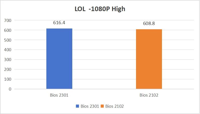 先看看網遊表現,英雄聯盟作爲一款10多年前開發的遊戲,對單核性能要求非常高,在新老版本測試重,新版2301和舊版2102幀數分別爲616/608,新版BIOS提升了8幀,算是對遊戲的優化吧。