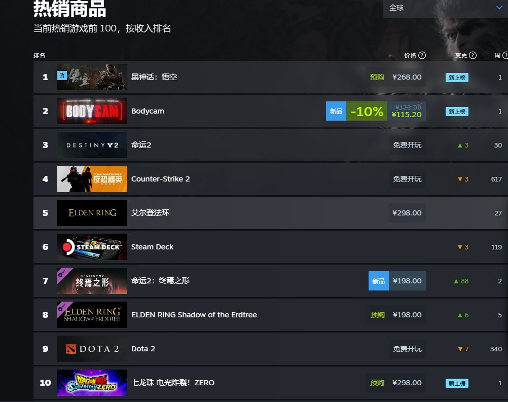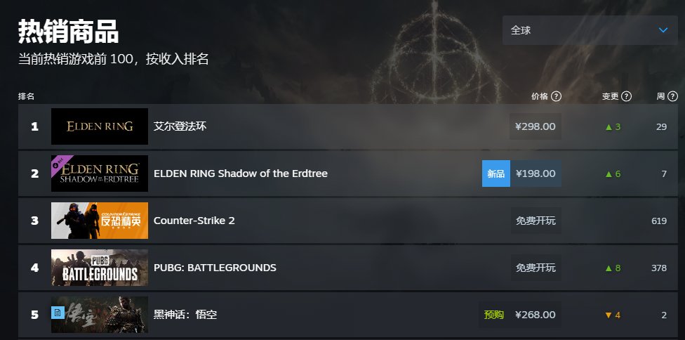 本來黑神話預售日經過幾天后掉到了Steam全球銷量榜第六,但是因爲這一波節奏又上升到了第四(第一艾爾登法環,第二絕地求生,第三CSGO),並且目前穩居第五名,其實除開免費遊戲和DLC,就是第二名