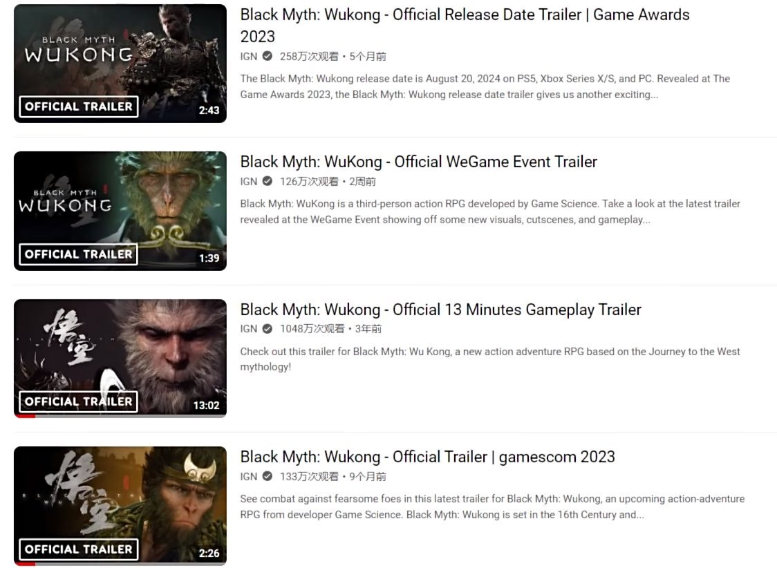 每次黑神話發宣傳視頻,ign都會在油管上同步更新。