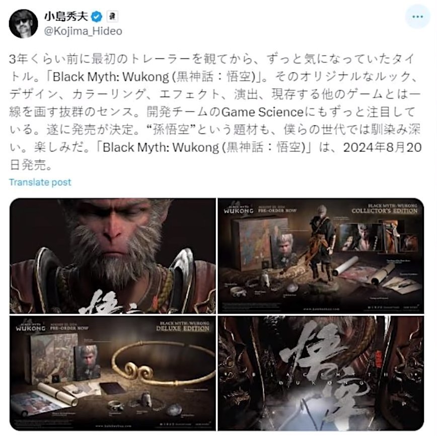 再來,曾開發過合金裝備系列和死亡擱淺的知名遊戲製作人小島秀夫在黑神話開啓預購後也發文表示祝賀,並說自己已經關注這遊戲三年了