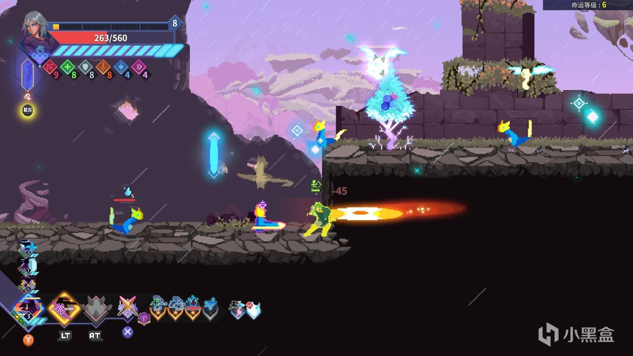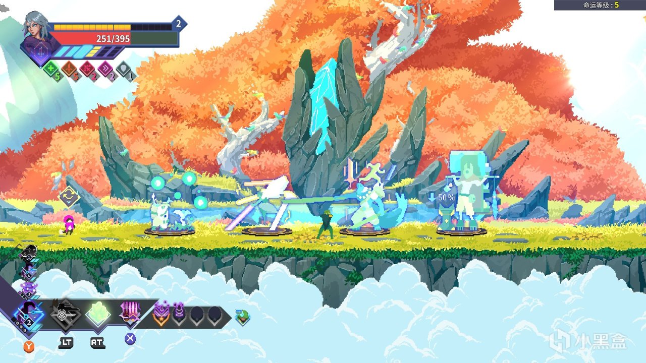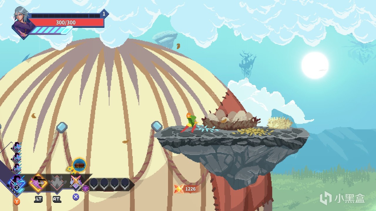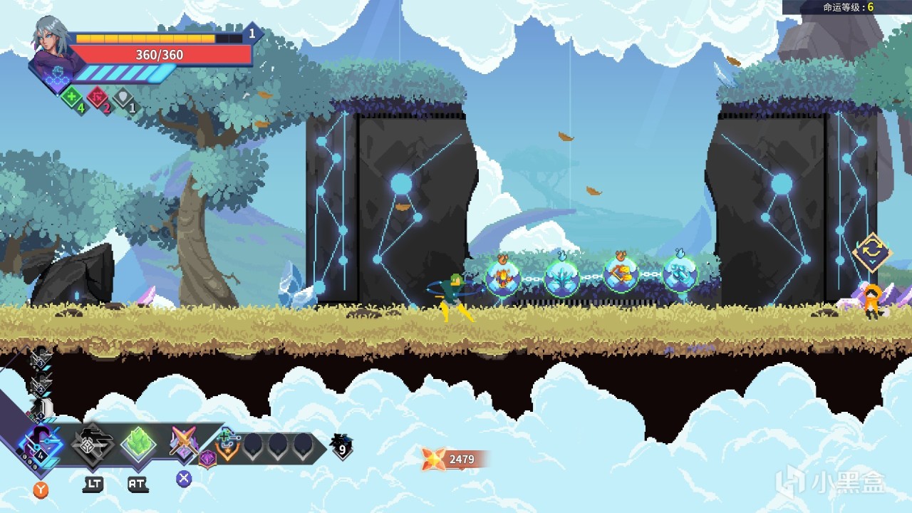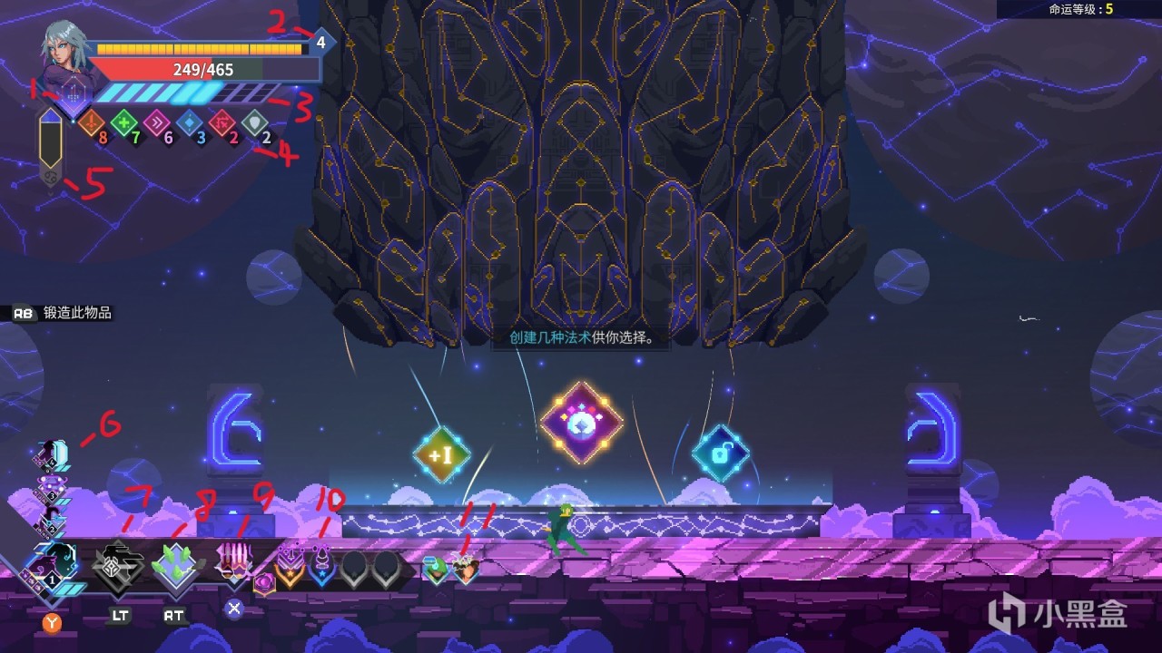 9.武器選擇,右下角爲選擇的被動,被動需完成任務方可解鎖。角色通常有二段跳,但可以更多。按上鍵和攻擊可向上攻擊,空中按下鍵和跳躍可墜擊。