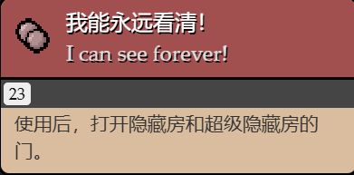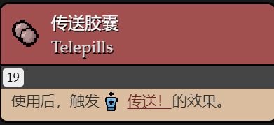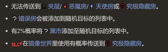 使用後,觸發道具傳送的效果(將角色傳送到隨機房間,包括隱藏房、超級隱藏房、錯誤房)