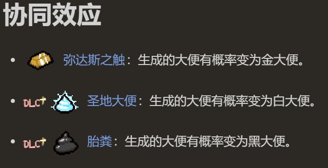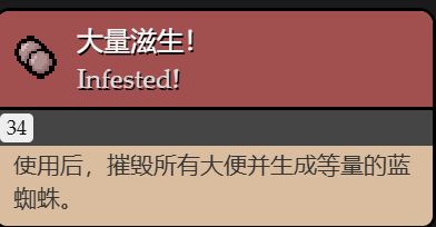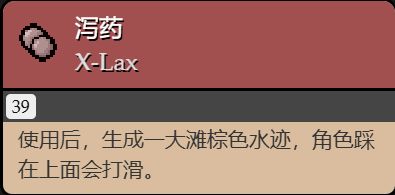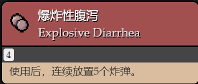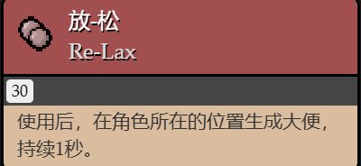 使用後,在角色所在的位置生成大便,持續一秒(這個把它放在好膠囊裏面的原因是生成的大便,打掉之後有概率會生成掉落物)