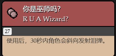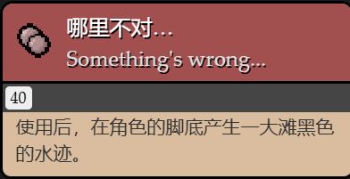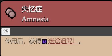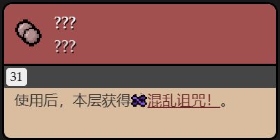 使用後,獲得混亂詛咒(混亂詛咒效果:在每次進入或傳送進一個房間時,有概率進入一個其他房間,同時,已探索房間之內的障礙或掉落物會被交換,在被傳送時會有屏幕震動和音效提示)