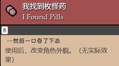 4.藥丸在使用之後會有正面或者負面效果 ,還有一小部分是無特殊效果,當角色喫到好膠囊時,角色會豎起大拇指。而角色喫到壞膠囊時,角色會用手捂住頭部(青春期是好膠囊,但是使用時角色也會捂住頭部,可能是因爲以撒不想長大吧)