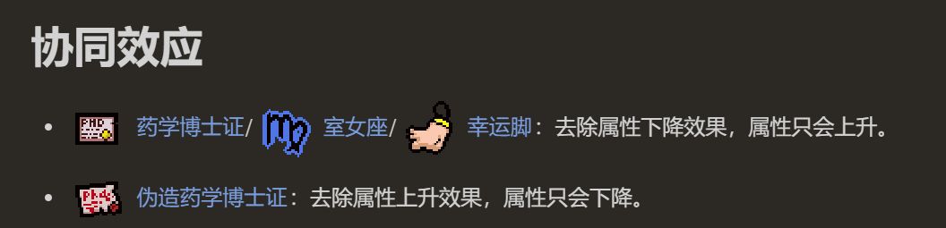 在你擁有道具藥學博士證、室女座、幸運腳時,這些屬性下降藥丸會變爲屬性上升藥丸
