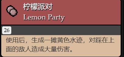 使用之後,會在當前房間內生成一攤對敵人造成傷害的黃色水跡,對於踩在地面的敵人,踩上去之後會造成大量傷害(空中敵人就不行了),持續一段時間後消失