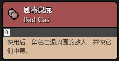 使用後:在當前房間內角色釋放出綠色毒屁,擊退附近的敵人,並使他們中毒