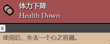 使用後,角色-1血上限(當角色的心之容器只有一顆時變爲體力上升)