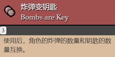 使用後,使角色炸彈和鑰匙的數量互相轉換(在懺悔版本後,金鑰匙和金炸彈的效果也會互相轉換)