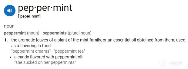 Peppermint在現實中對應的食物是胡椒薄荷,一種原產於歐洲的,由綠薄荷和水薄荷雜交而來的雜交薄荷,可用於食物調料或入藥,在歐洲普遍用來泡茶。胡椒薄荷提煉出的薄荷油具有清涼和提神的作用,但本身具有一定刺激性(和角色性格還挺像的233)。