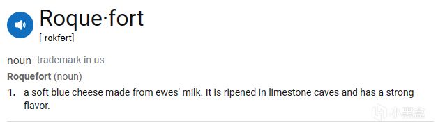 Roquefort是一種富有盛名的藍紋奶酪,產自法國南部山區Savoie薩伏瓦地區。洛克福爾奶酪與和產於意大利的戈貢佐拉乾酪(Gorgonzola)、英國的斯蒂爾頓乾酪(Stilton) 等並稱世界三大藍黴乾酪(The Big Three)。羅克福奶酪外觀呈白色,帶有強烈的鹽香味,手感溼軟而易碎,通體布有均勻的藍色紋路(遊戲裏角色的衣服也和這一點很像)。它氣味獨特,入口先感醇厚,繼而甘甜,再轉爲煙燻味,最後化爲鹹味留在口中。
