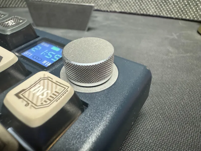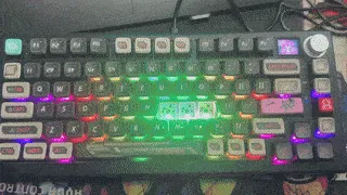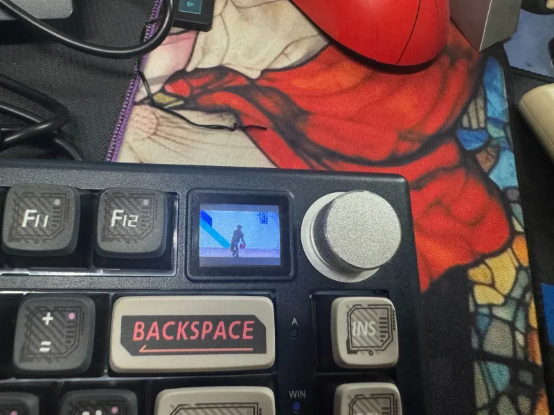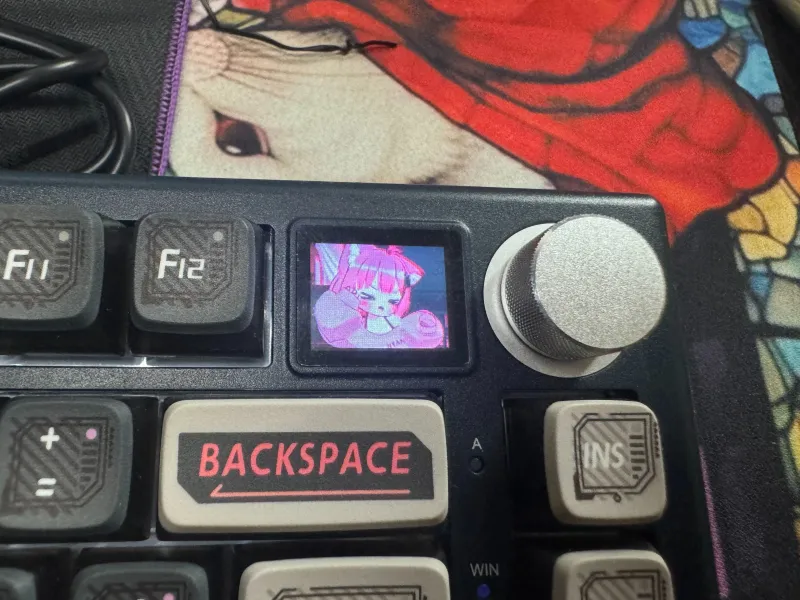 整塊鍵盤映入眼簾的便是旋鈕和屏幕了,最近旋鈕和屏幕這種原本中高價鍵盤的標配也越來越多沉底到低價鍵盤市場,也是非常可喜可賀的一件事。鍵盤的屏幕不大,大概是兩個鍵帽左右的大小寬度,顯示的信息也是比較關鍵的,電池電量和連接模式,還可與自己操作更換動圖。