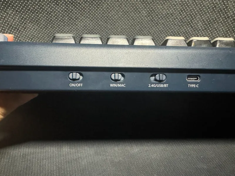 鍵盤前方有幾個操作開關,分別是開關,win還是mac模式,接收器藍牙還是有線模式,還有一個typec連接口。個人感覺開關做的都比較凸出,非常方便大家進行切換。無線連接比較快速,使用中喚醒的速度屬於第一梯隊。