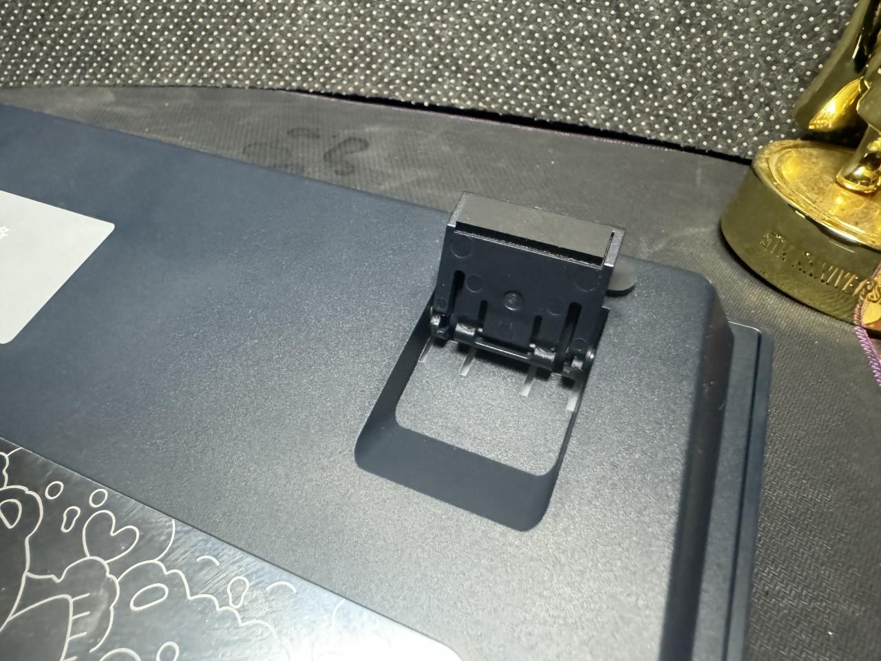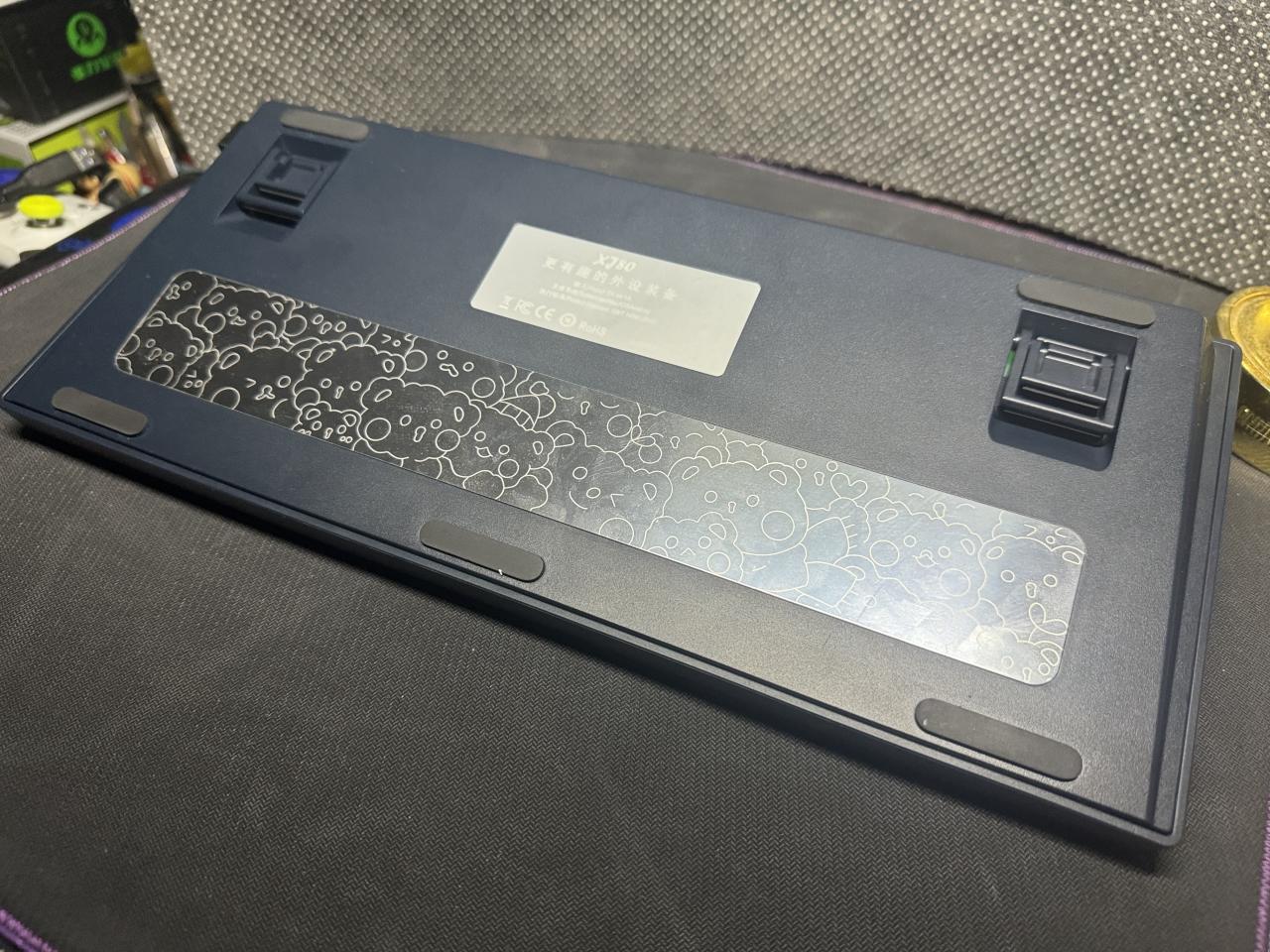 鍵盤底部有兩塊銘牌,較大的那一塊是熊熊形狀的反光銘牌,另一快小的一點的則是鍵盤商標牌子等信息。還有兩個兩段式的腳撐,不過腳撐尚矮,我一般都會使用第二段較高的,第一段就很少使用。