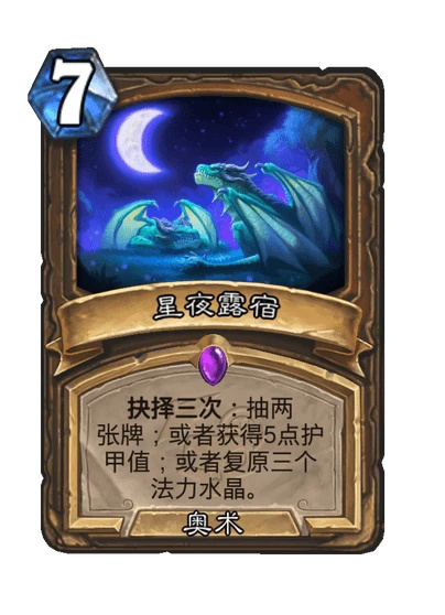 7費:抉擇三次:抽兩張牌;或者獲得5點護甲值;或者復原三個法力水晶。