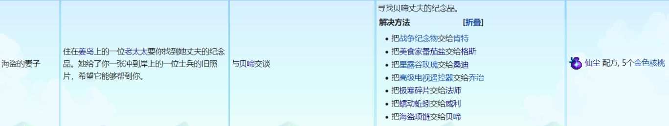 其實這個任務就是一個跑腿任務,我們給正確的人後就會與其交換一樣物品,然後繼續給下一位,下面直接說順序:貝啼(戰爭紀念物)—肯特(美食家番茄鹽)—格斯(星露谷玫瑰)—桑迪(高級電視遙控器)—喬治(極寒碎片)—法師(蠕動蚯蚓)—威利(海盜項鍊),最後把海盜項鍊給老奶奶(貝啼)即可完成任務,你會獲得5個金核桃➕仙塵的配方,這裏根據我的遊玩過程,把玫瑰給艾米麗,把高級遙控器給潘姆或艾芙琳,把蠕動蚯蚓給文森特,都會觸發一些特殊對話(這裏在joja鸚鵡買金核桃的玩家注意,你買了金核桃後也是需要完成這個任務才能獲得仙塵配方,本身這裏作爲金核桃全收集是不會遺漏的,但1.6更新後可以在joja鸚鵡那買金核桃,可能有的玩家會遺漏掉,我提醒一下)