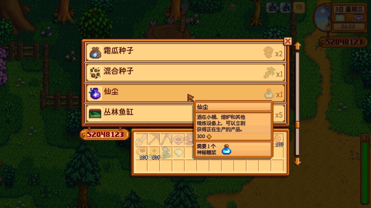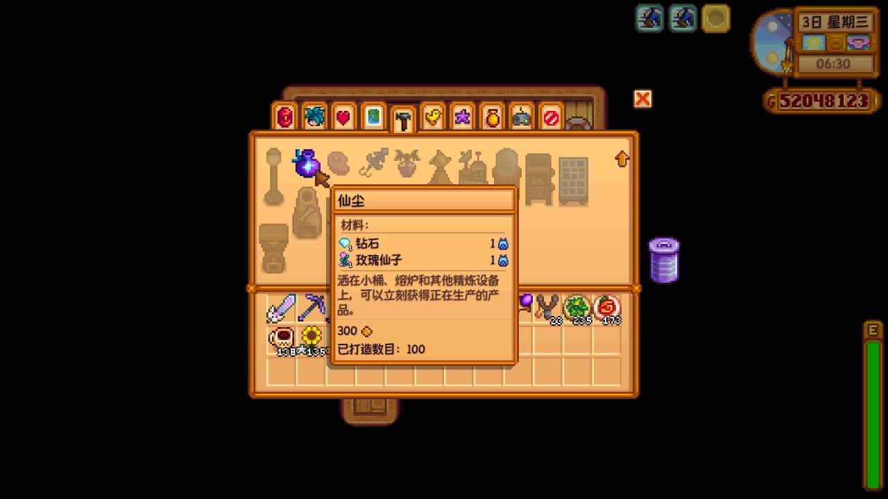 全物品出貨和全製造在遊戲後期是很重要的,想達成遊戲結局和全成就的玩家是肯定要完成這兩個指標的,在全物品出貨中,有很多物品都是需要精煉設備產出的,比如恐龍蛋黃醬,奶酪,蜜蜂酒,蘑菇幹這些,對應就要使用到蛋黃醬機,壓酪機,小桶,烘乾機,你急着出貨的話,可以使用仙塵來直接產出,可以省不少時間,全製造也是一樣的,比如製作織布機要松焦油,松焦油需要你把樹液採集器掛在松樹上等待5天才能獲得,這時你使用仙塵就可以直接獲得