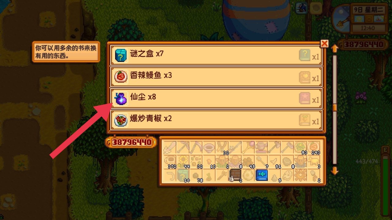書攤老闆每個季節都會在鎮上擺攤兩次,書攤老闆的位置位於joja超市後面,具體時間大家看日曆就行,在書攤老闆營業的當天左下角也會提醒你,你可以在書攤老闆那使用1本星之書兌換8個仙塵