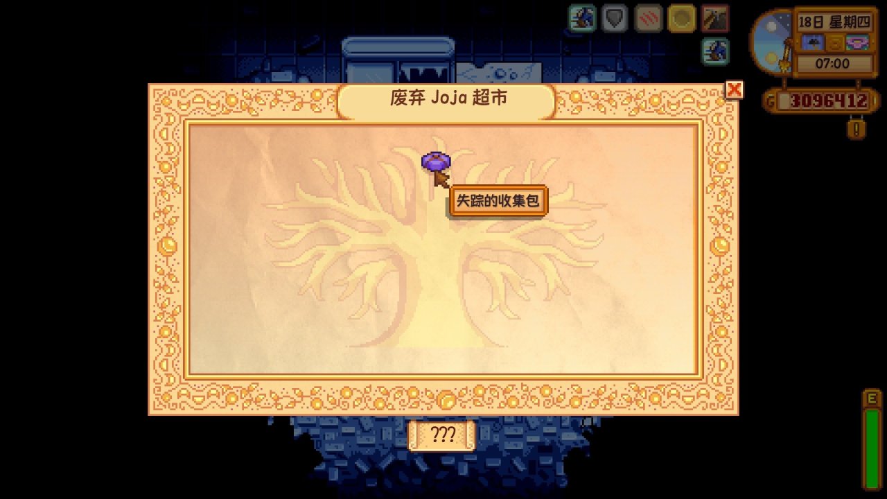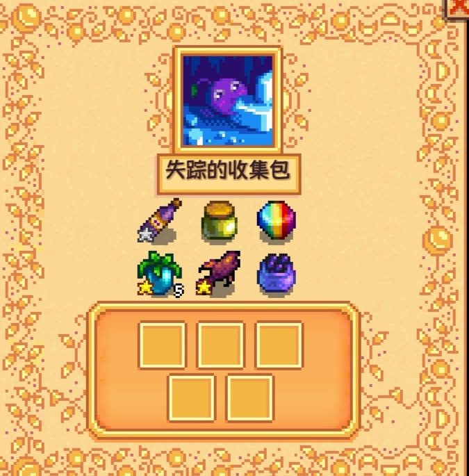 我們進去後即可看到廢棄joja超市的獻祭板塊,裏面只有一個收集包,是“失蹤的收集包”,這個收集包是我們獻祭流程中的最後一個收集包,完成後即可開啓電影院