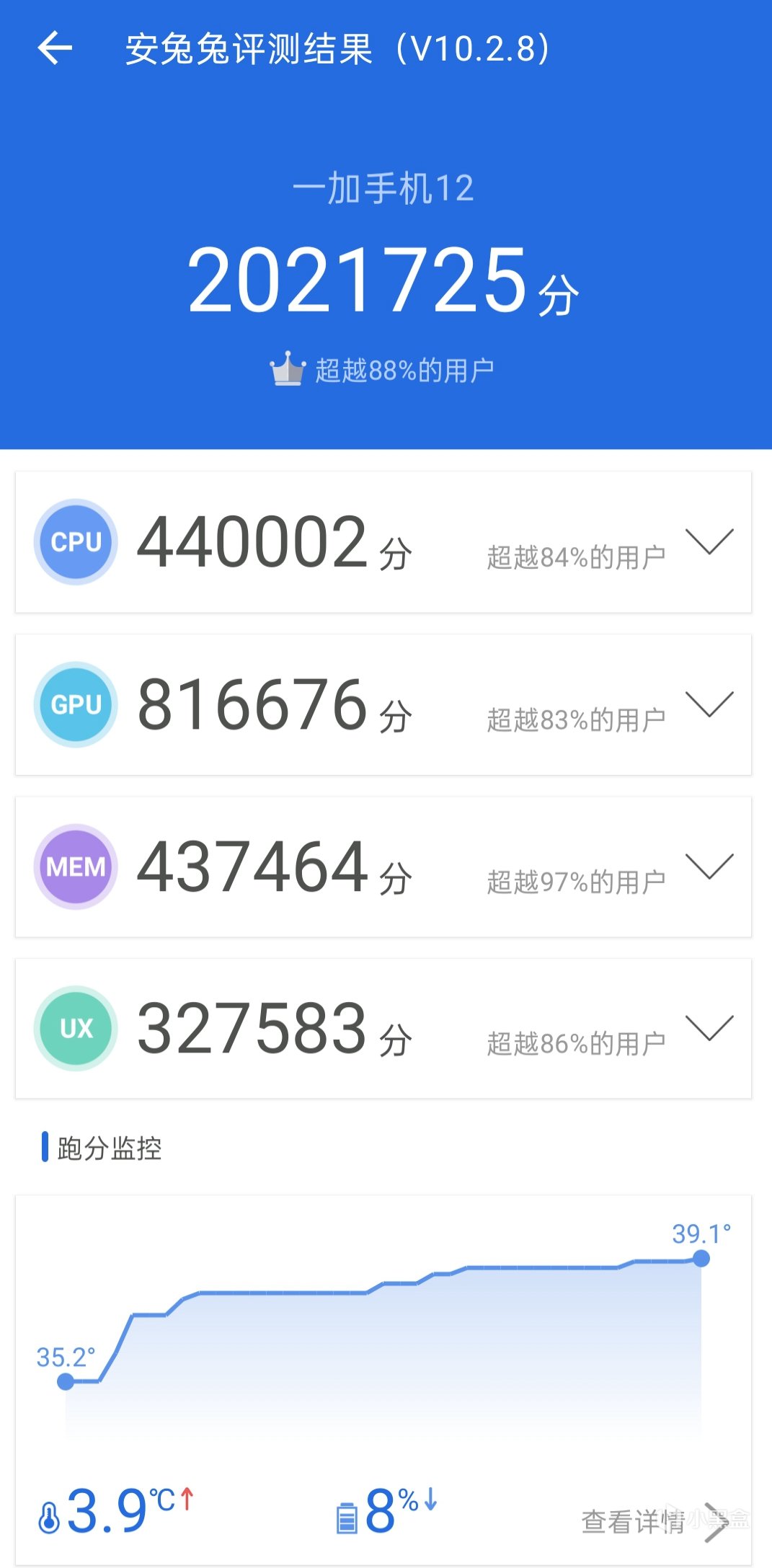 從測試也能看到,跑完整個安兔兔評測,一加12溫度僅僅上升了3.9攝氏度,電量也只下降了8%,可見一加12的散熱與續航能力都不錯。