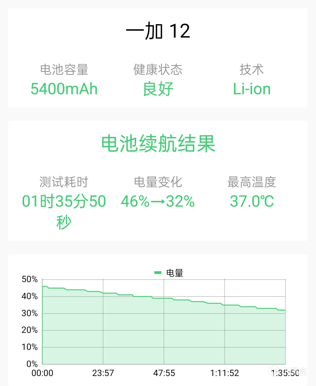 我用電池狗狗做了一下測試,模擬測試循環跑了N遍,一個半小時才把電池從46%用到32%,這樣算起來,一加12滿電的情況下能夠堅持11個小時以上的連續使用,完全沒有電量憂慮。