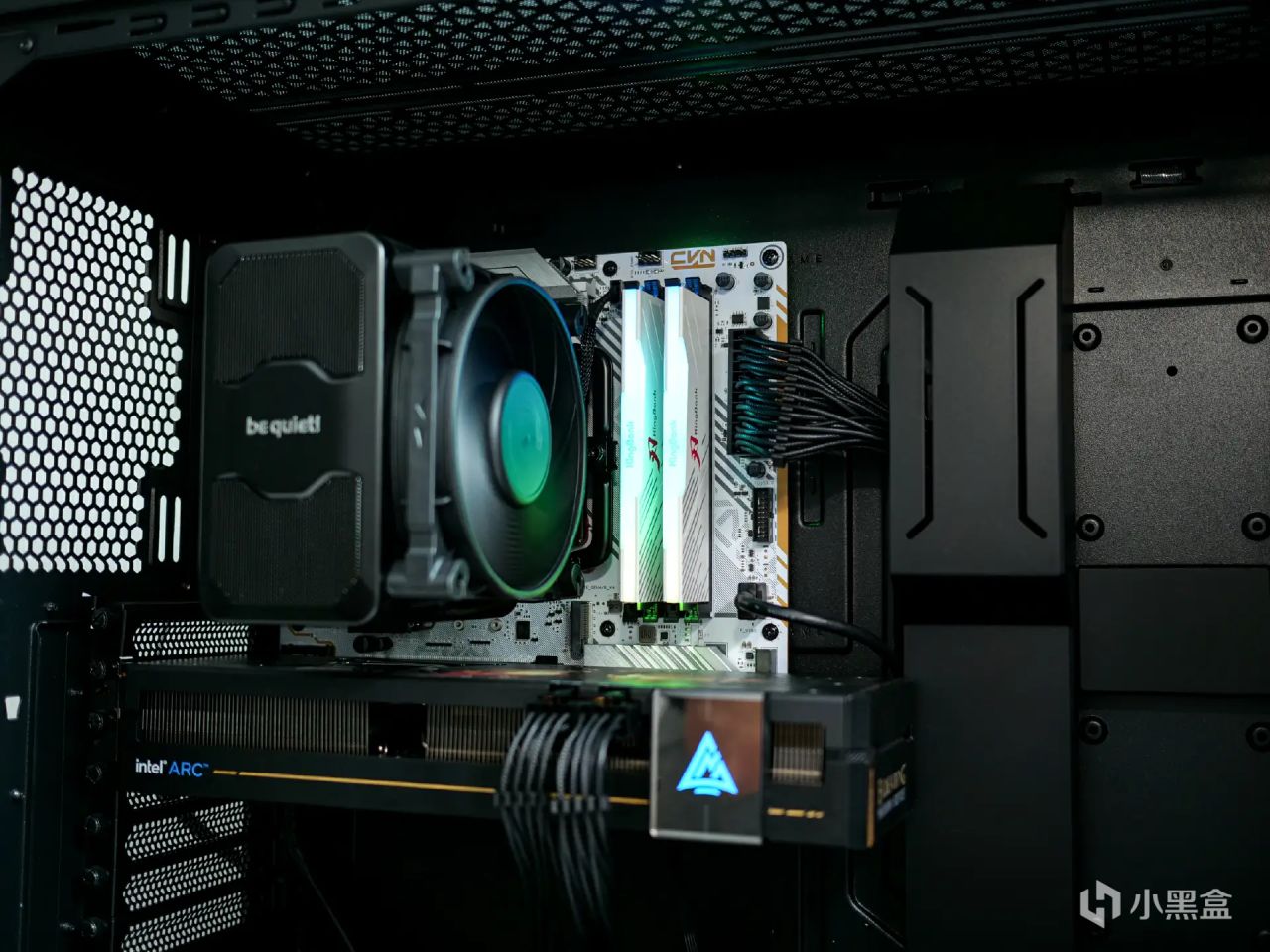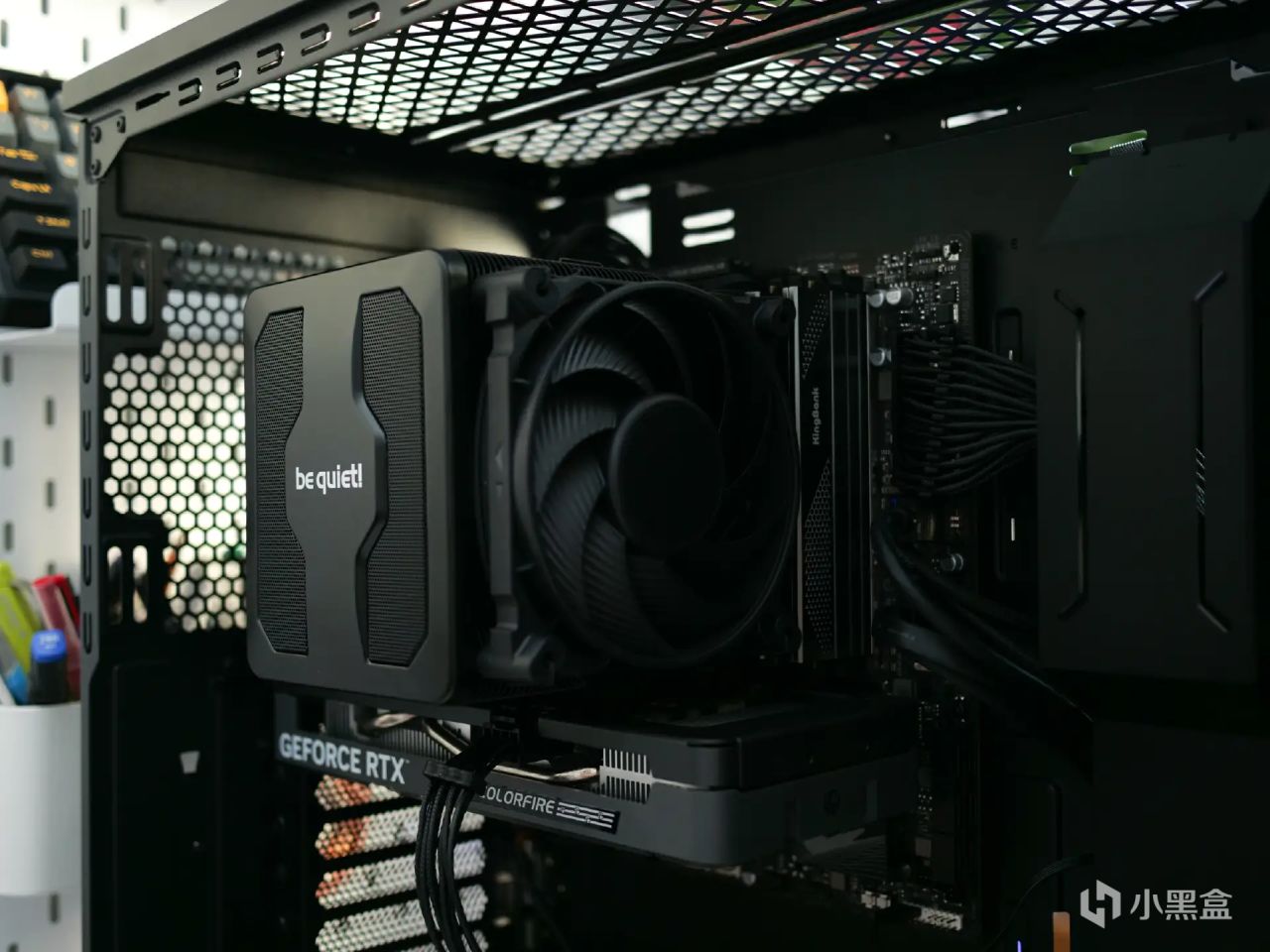 測試搭配的CPU散熱是來自德靜界的DARK ROCK PRO 5風冷散熱器,單塔設計,擁有TDP 210W的最大解熱功耗。散熱器採用全黑設計,散熱器主體噴塗有含陶瓷顆粒的特殊塗層,可以幫助熱量散發,散熱鰭片也是採用了錯位切割設計,可以有效增強散熱效率。