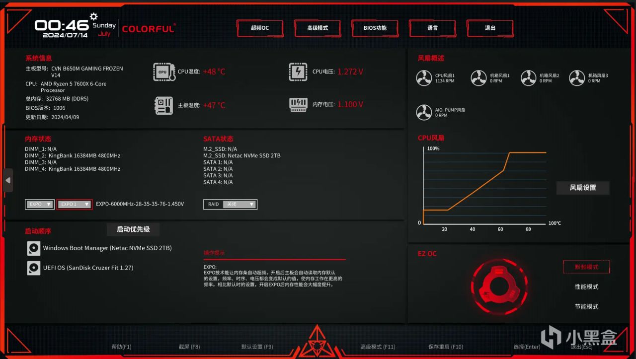 開機按Del鍵進入BIOS,這裏可以看到金百達白刃DDR5 6000 CL28 16Gx2內存初始頻率爲4800MHz,選擇開啓EXPO1 6000 CL28設置,F10保存後退出。