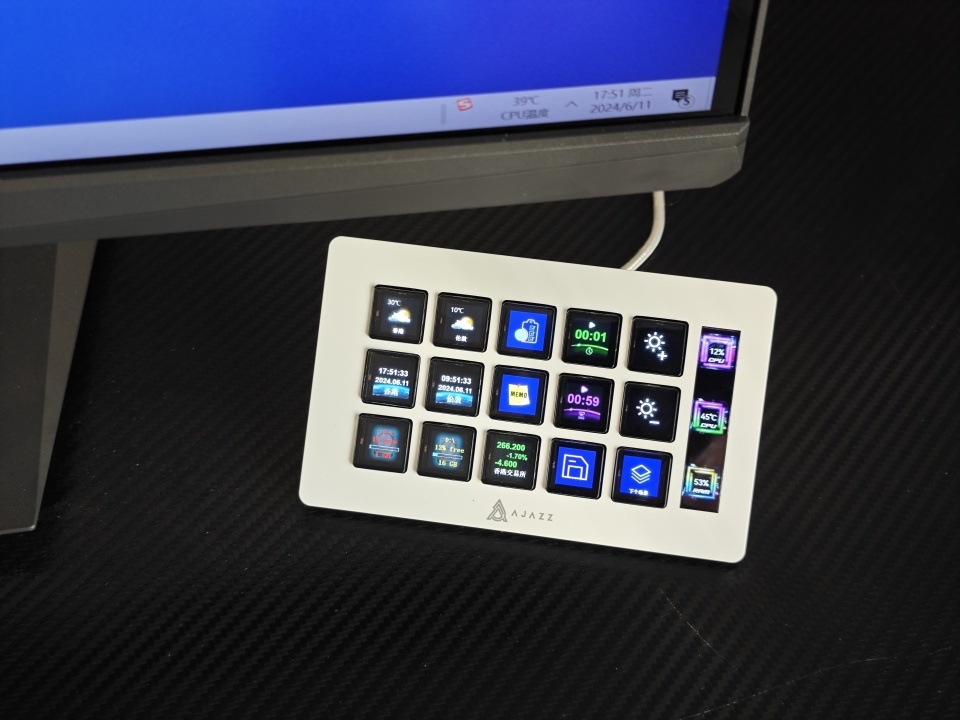 黑爵AKP153桌面控制檯左邊爲按鍵區域,擁有15個Switch Blade按鍵,通過配套的軟件可以對這些按鍵的功能進行自定義,而且還支持翻頁操作,總共可以自定義四個屏幕,分別是信息看板、常用網站、WINDOWS控制、音樂控制檯,信息看板作爲第一屏我們可以定義常用的功能,比如:天氣、股票情況、備忘錄、常用軟件的各種快捷鍵等等,重要信息一目瞭然,輕輕一按就可以實現各種快捷操作,簡直是桌面神器,此外所有圖標還可以自己定義,輕鬆打造專屬桌搭氛圍。