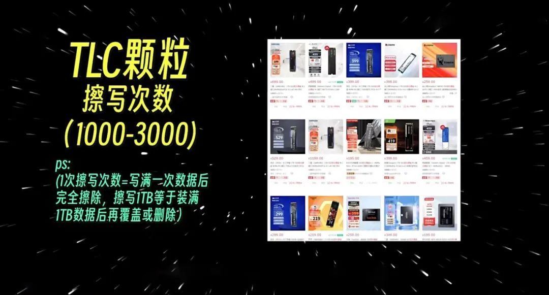 這時候有的人肯定會說:那我直接買一塊SLC的硬盤不就好了,還是太天真了,目前市面上呢,大部分的固態使用的都是TLC顆粒,它的擦寫次數大概在1000-3000次,不過各位也不必驚慌,按照普通人的正常使用情況啊這個次數妥妥夠用了,而少數QLC顆粒則是需要避開的雷區,隨後呢就是生產工藝,大部分知名品牌基本都有自主生產顆粒的能力,自主生產的顆粒檢測通過後呢進行封裝售賣,這種就是原廠顆粒,而那些檢測不通過的顆粒有的則被打包賣給了一些不明廠家,這就是傳說中的黑片,黑片的質量參差不齊,至於買來的固態爲什麼會壞,這就不得不提到那傳說中駭人聽聞的0(零)E問題了,這是右主控方案導致的,出現0E問題說明你的固態隨時會出現不可逆轉的損壞。