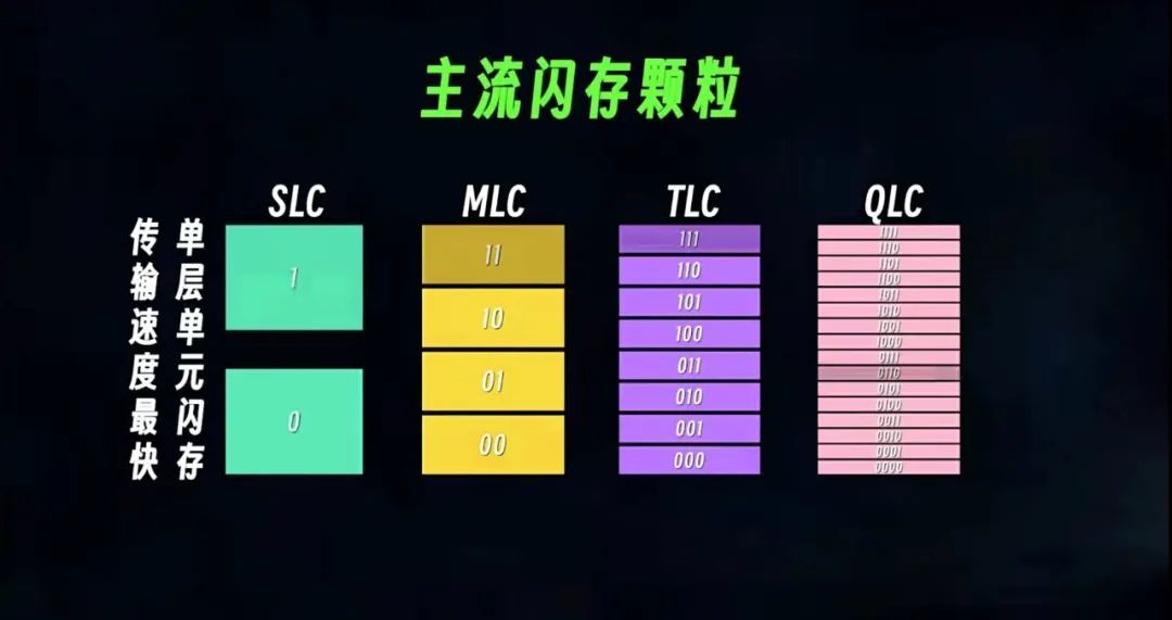 速度慢還有一個原因則是來自閃存和顆粒,閃存顆粒在固態硬盤中就是複製存放數據的地方,所以閃存顆粒的品質好壞非常重要,目前主流的閃存顆粒分爲這四種。