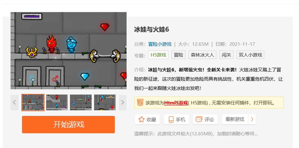 《森林冰火人》是一款雙人合作的Flash小遊戲,玩家需要控制兩個角色:水女孩和火男孩,通過森林中的各種障礙,收集寶石併到達終點。遊戲以其簡單的操作、益智的關卡設計和需要玩家協作的特點而受到歡迎。每個角色都有自己不能接觸的元素,需要相互配合才能順利過關。