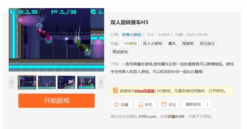 《雙人旋轉賽車》是一款在4399小遊戲平臺上流行的在線賽車遊戲。遊戲特色在於它的雙人對戰模式,允許兩名玩家在同一臺電腦上進行實時比賽。玩家可以選擇不同的賽車和賽道,通過控制賽車的轉向和速度來爭取勝利。