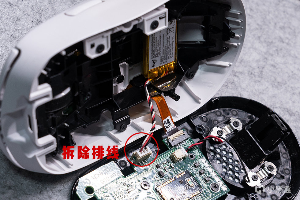 接下來,需要做的是拆除電池與主板之間的連接排線。電池是使用雙面膠粘貼在鼠標上殼上的,可以直接將其扯下來。