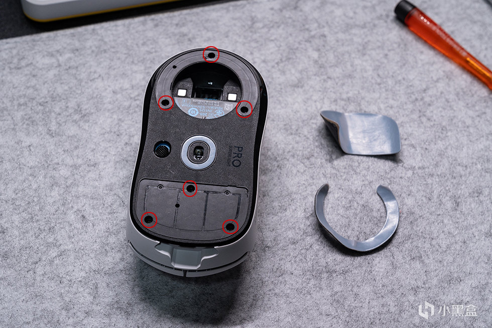 GPW二代的電池是內置的,這就意味着如果需要更換電池,首先必須對鼠標進行拆解。打開鼠標電池倉的過程是先從鼠標底部開始,需要先取下底部的配重蓋板,然後移除原裝的腳貼。