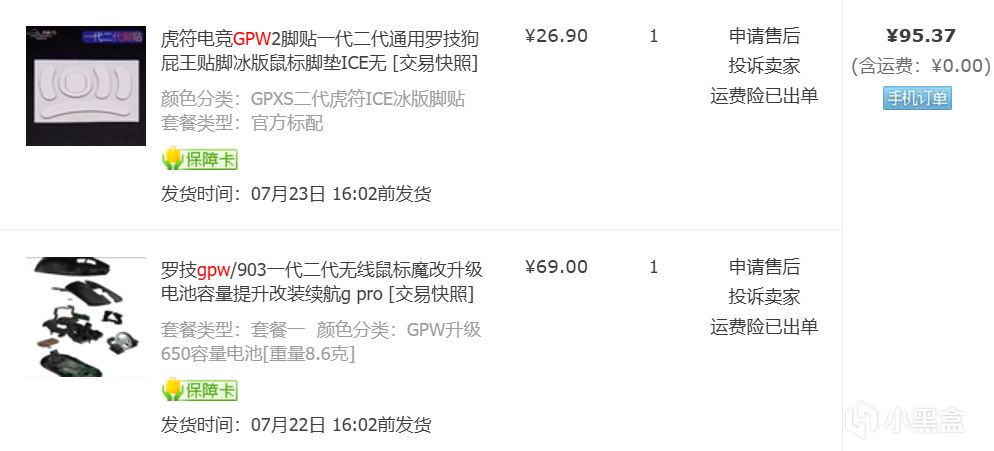 本次購買了650mAh電池一塊,虎符腳帖一套,共計花費95.37元。