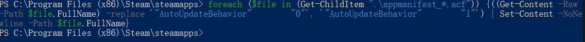 再輸入【foreach ($file in (Get-ChildItem ".\appmanifest_*.acf")) {((Get-Content -Raw -Path $file.FullName) -replace '"AutoUpdateBehavior" "0"', '"AutoUpdateBehavior" "1"') | Set-Content -NoNewline -Path $file.FullName}】,按回車運行
