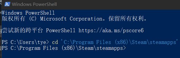 打開powershell之後直接輸入【cd 'C:\Program Files (x86)\Steam\steamapps'】後回車